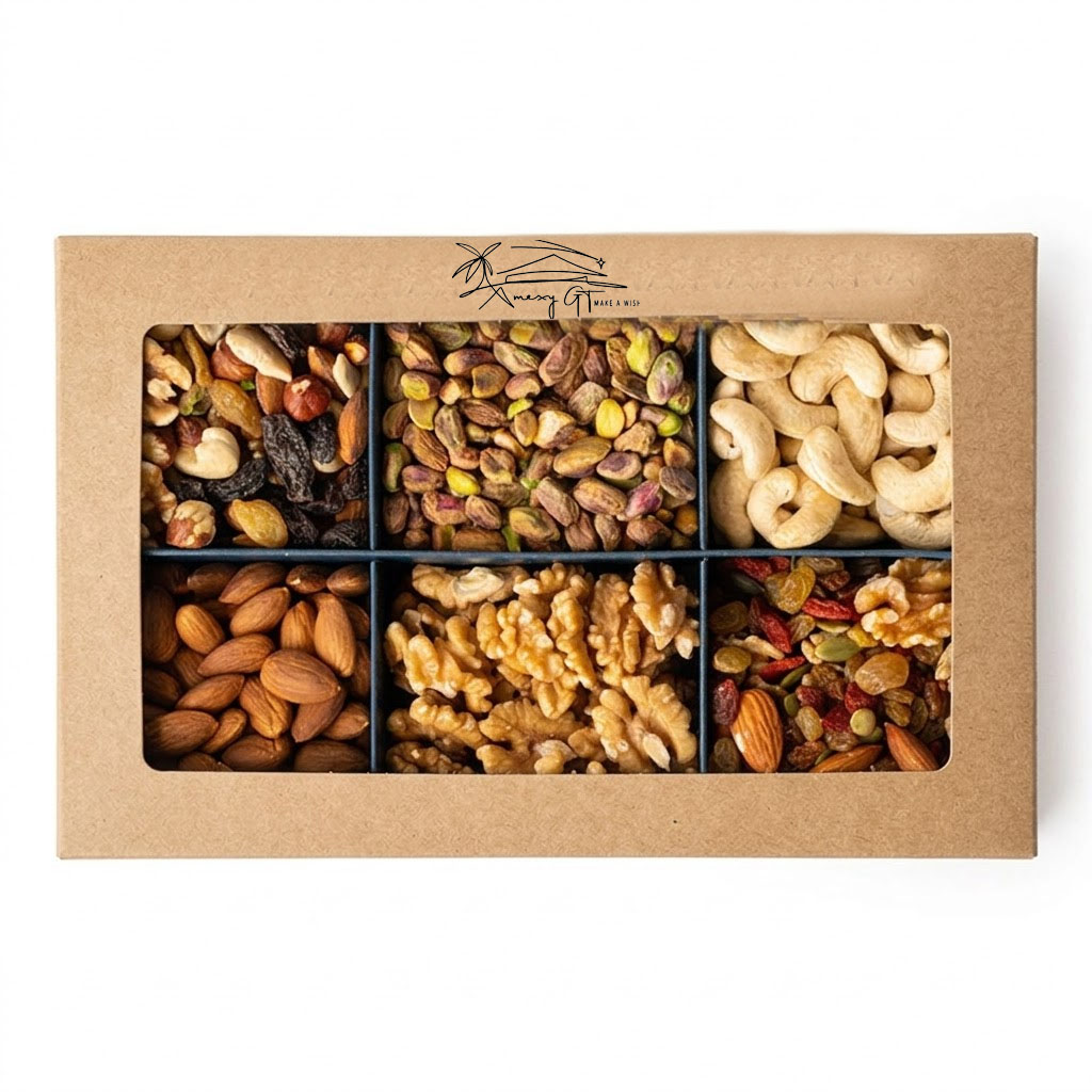 Experience a world of flavor with the Assorted Dried Fruits & Nuts gift box. We provide a hand-picked, premium selection of crunchy nuts and sweet dried fruits in a beautiful 6-compartment tray. This 600g box is the perfect “Naturally Delicious” choice for gifting, hosting, or sharing special moments with family and friends.