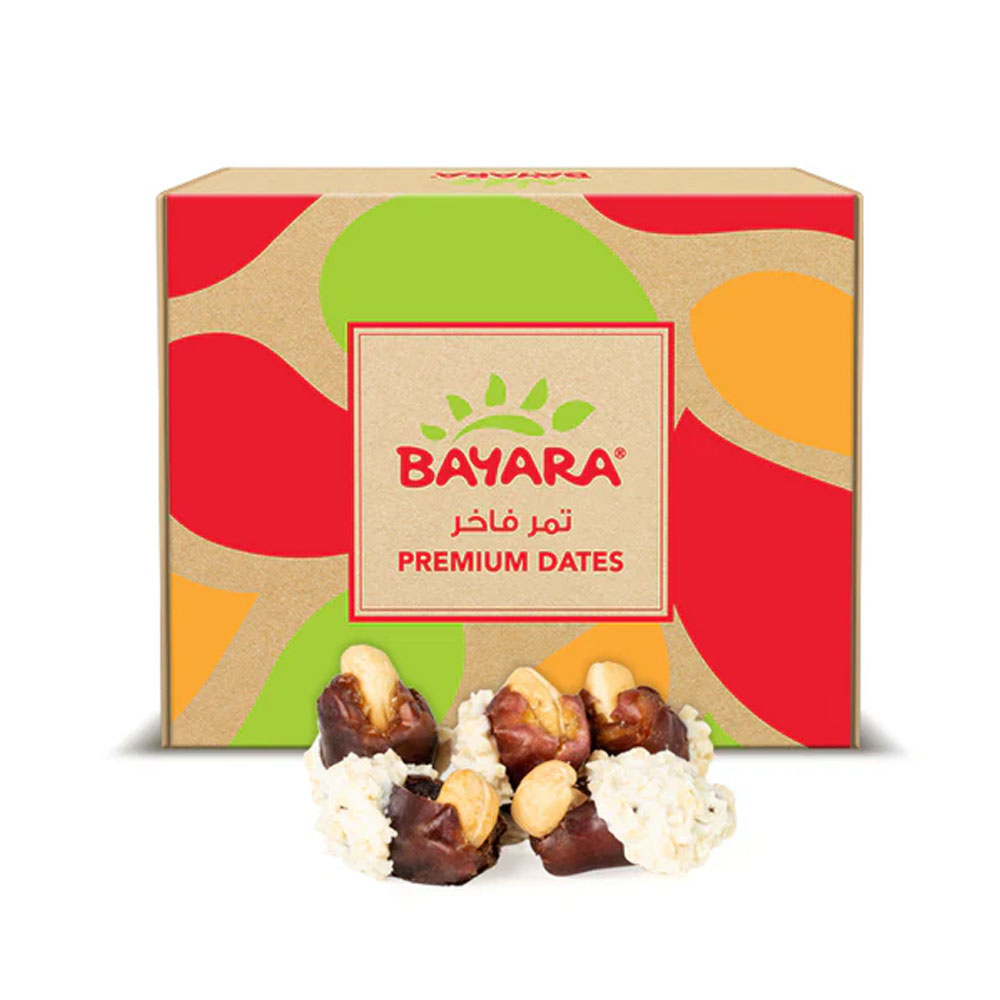 We bring a touch of luxury to your snacking with Bayara Coated Dates. We carefully select the finest dates and fill them with a whole, toasted cashew nut to ensure you receive a “Naturally Delicious” combination of soft and crunchy textures.